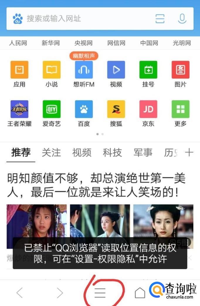 然后来到QQ浏览器首页,点击屏幕下方三条直线的图标,如下图所示。