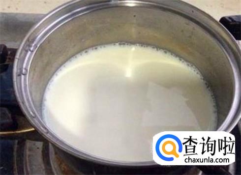 这儿我要说明一下,有些婴儿喝牛奶,所以可以添加牛奶,有些婴儿不喜欢牛奶的味道,或者对牛奶过敏,那么就不要加牛奶了。将牛奶倒出来一些,放在奶锅里面煮开。