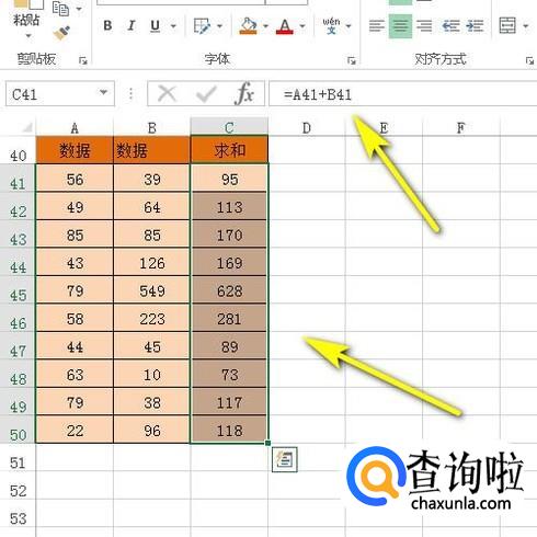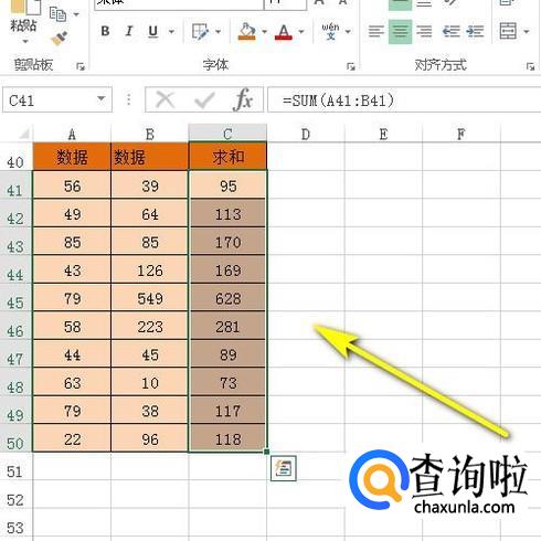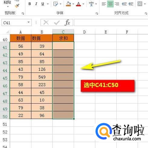 选中C41:C50这些单元格;再在编辑栏输入求和公式:=SUM(A41:B41)