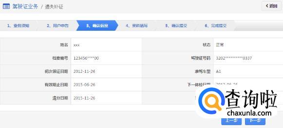 在该步骤,界面显示驾驶证的基本信息,用户认真确认各项信息无误后,点击【下一步】进入【资料填写】。