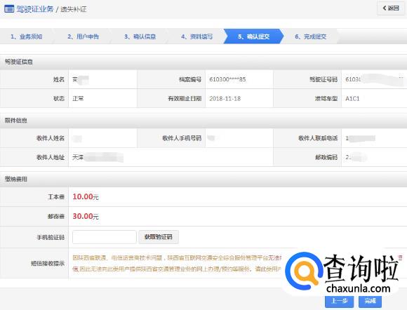 在该步骤,用户选择领取方式是邮政寄递或窗口自取。业务成功受理后,如果选择邮政寄递的,邮政人员将上门收取费用,交付机动车驾驶证及收费票据。如果选择窗口自取的,则自行到选择的自取网点窗口领取机动车驾驶证。