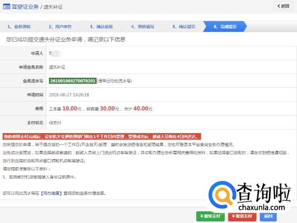 如果平台支持在线缴纳工本费与邮费且选择在线缴费,提交完成后显示如下: