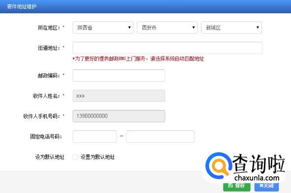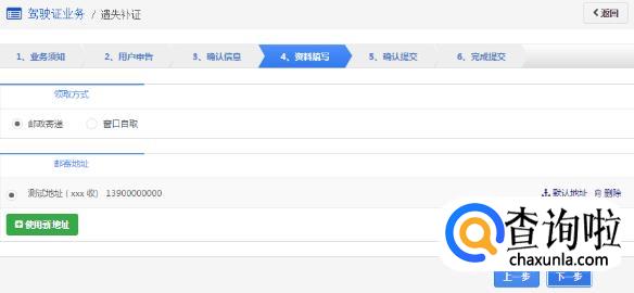 如果选择邮政寄递的方式,用户需认真填写驾驶证邮寄地址等相关信息。用户可以设置默认地址,删除地址,并且使用新地址。点击【使用新地址】,可以新增邮寄地址。