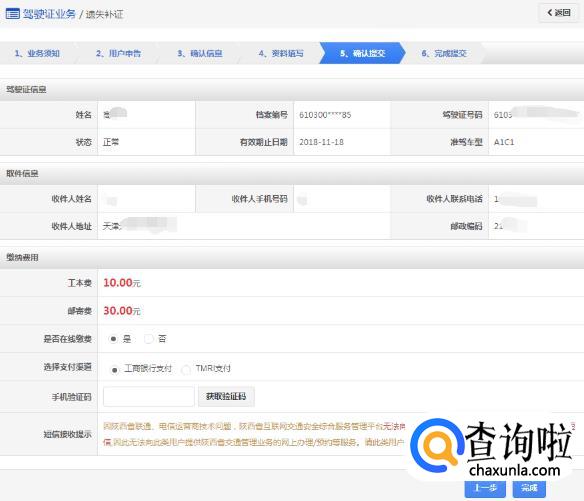 该步骤显示用户的驾驶证信息、领取详情以及需要缴纳费用信息,如果平台已开通在线支付功能,显示在线支付详情。