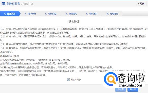 在该步骤,用户需认真阅读其内容,包括:办理遗失补证需要注意的各项内容和相关责任,如下图所示。同意的,勾选“阅读并同意”,点击【下一步】进入【用户申告】。