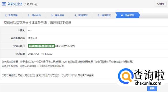 该步骤提交成功后,系统生成业务流水号。该步骤提交成功后,系统将于提交后的一个工作日(不含当天)受理(选择在线支付的业务费用支付完成后受理),届时会发送短信告知受理结果。用户可以根据该业务流水号在网办进度中查询业务办理进度。