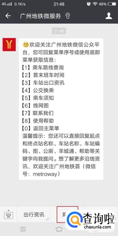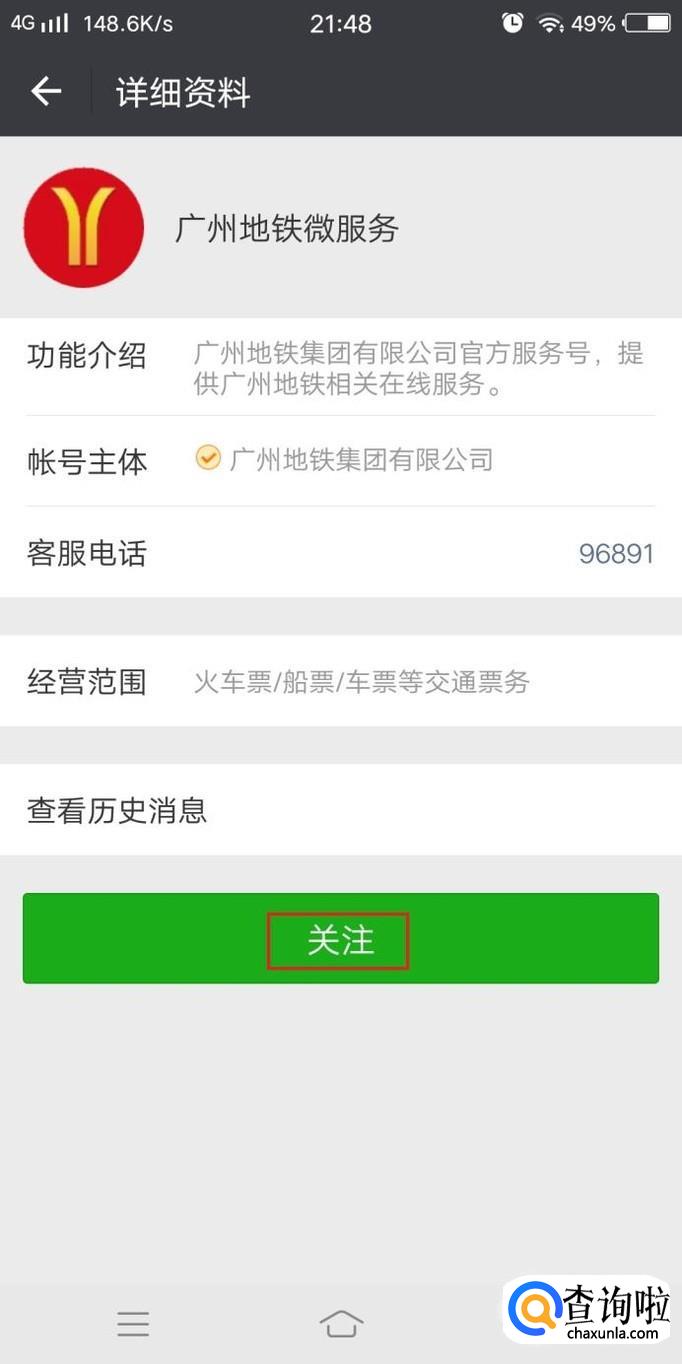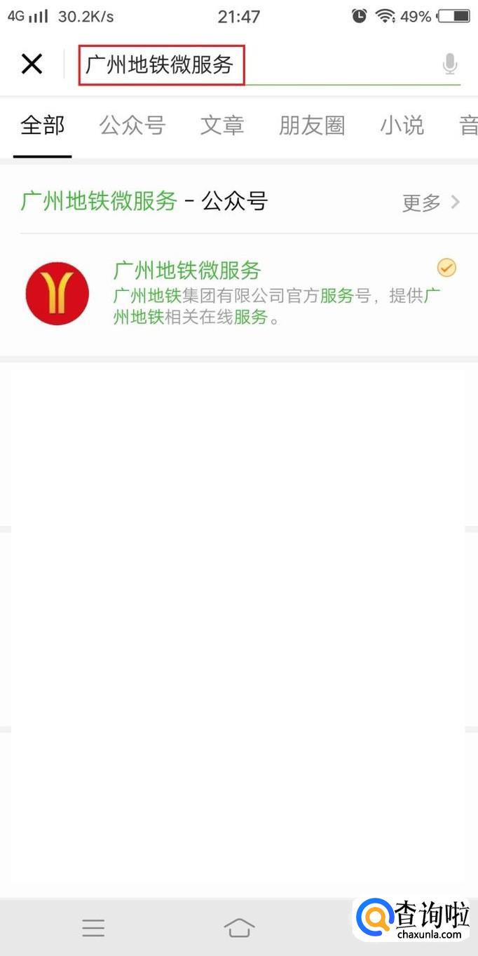 在搜一搜中搜索“广州地铁微服务”,进入并关注,如图所示