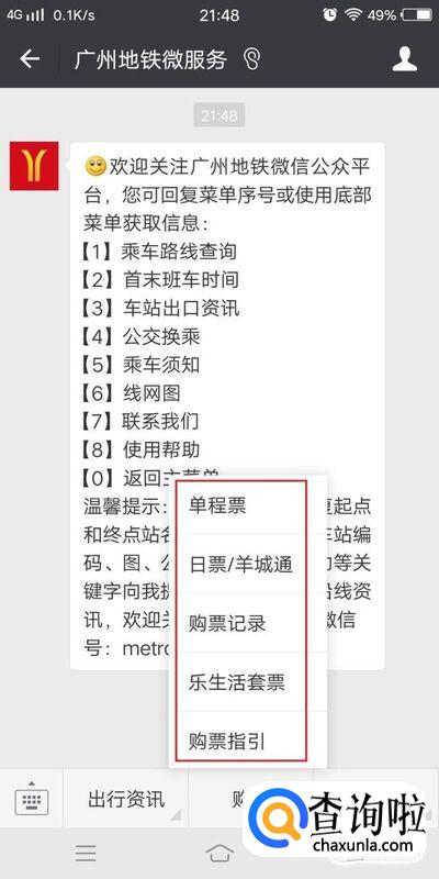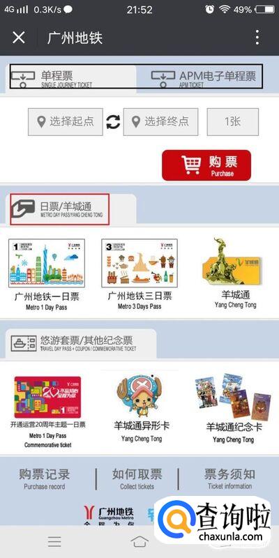进入广州地铁微服务公众号后,点击购票,在购票中可以购买多种类型的车票,随意选择一种,如图所示