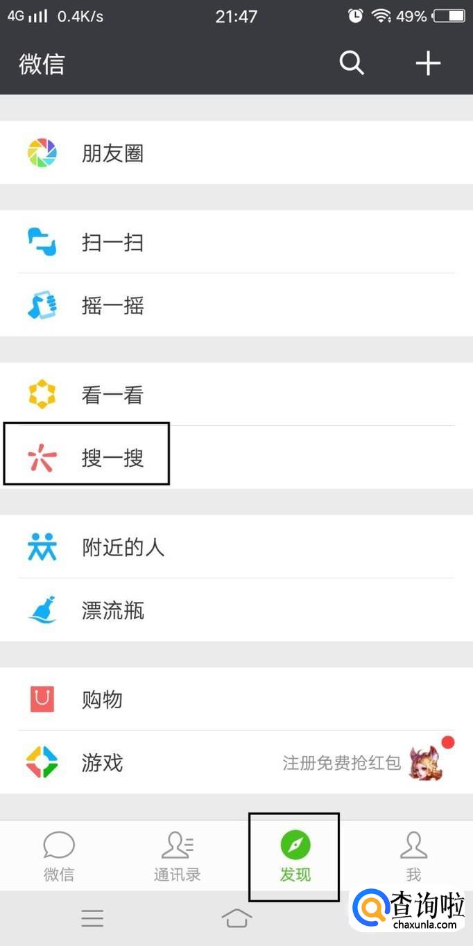 首先打开手机微信,进入发现——搜一搜,如图所示