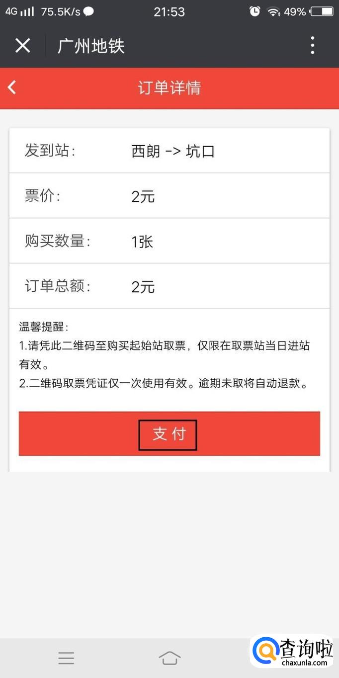 点击购票后,核对订单详情,点击支付即可,如图所示