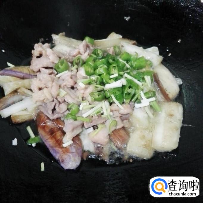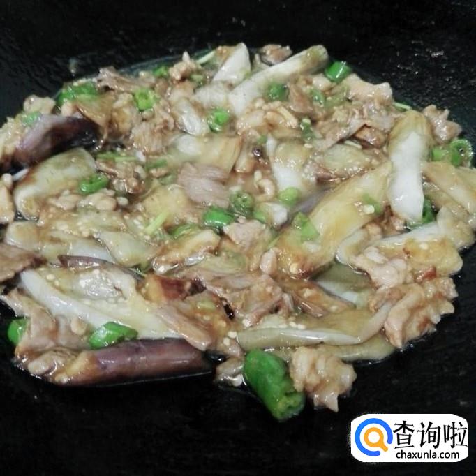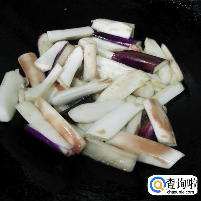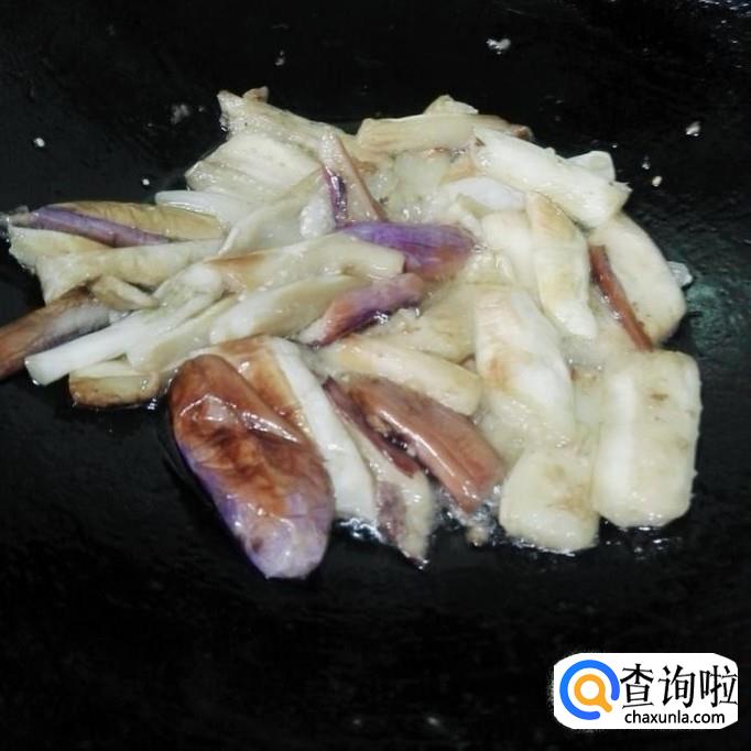 另起锅,来炒茄子,茄子因为腌过,很容易炒熟的,一般炒二分钟就好,炒到茄子软,皮子有点焦黄了就好。