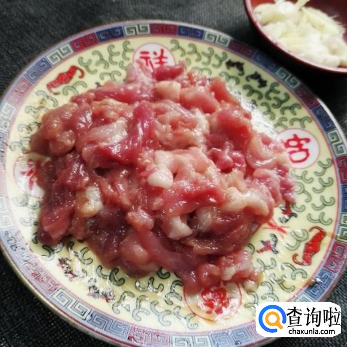 先把猪肉洗干净,再放生粉,蚝油,鸡粉,盐,几滴花生油,搅拌均匀后腌五到十分钟。