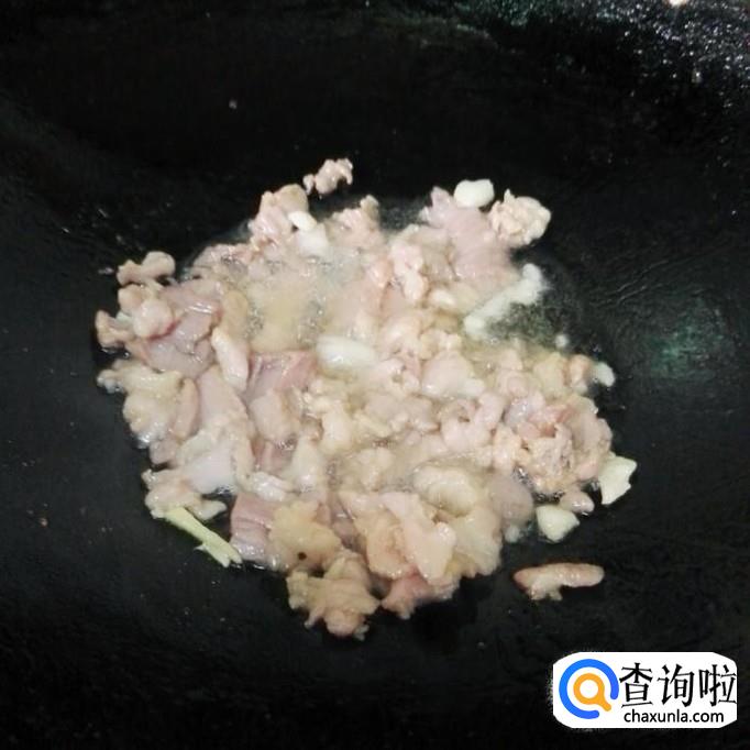 锅烧七成热放少量花生油,先下大蒜小火煸出香味,再把猪肉倒下去转大火爆炒至肉变成白色再铲在盘子里备用。