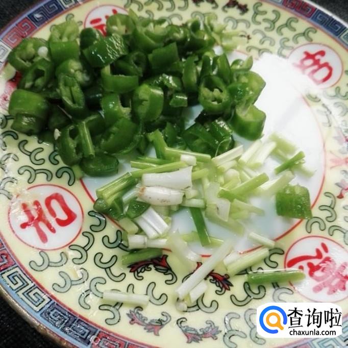 把青椒去籽切碎,香葱去根和黄叶,再洗干净切成葱花。大蒜籽去皮切碎,都放在一起备用。