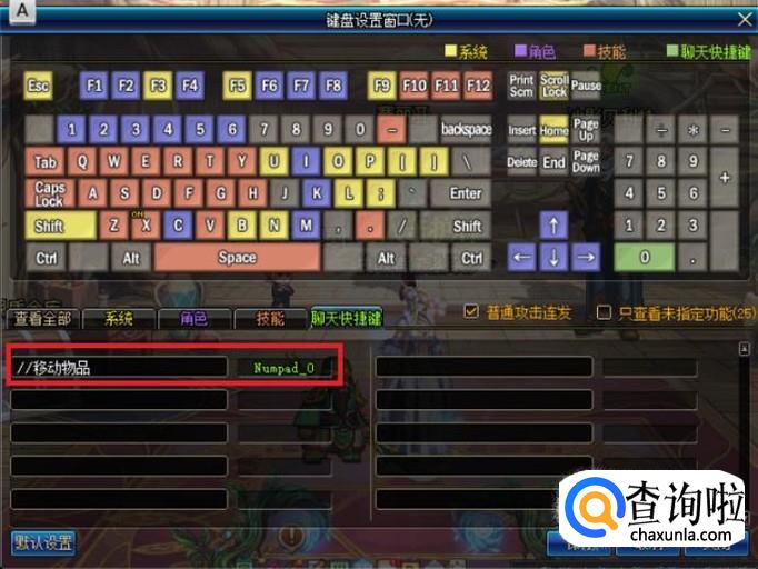 在前面的方框内输入“//移动物品”,并点击后面的方框,按下所要设置成执行该项命令的键位,点击“保存”,即可在地下城中,成功使用该键将物品移动至角色脚下。