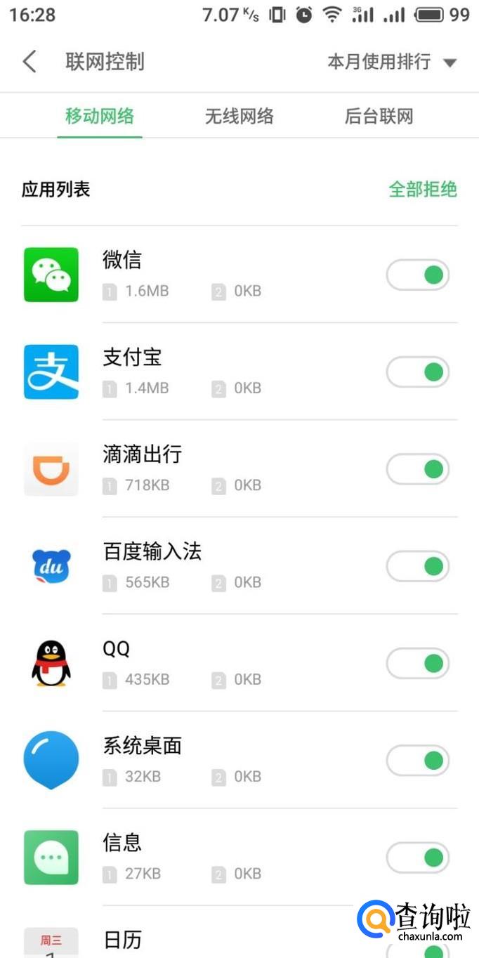 进入联网控制界面,我们能够查看应用所使用的流量,右侧滑块能够权限设置应用是否能够使用流量。