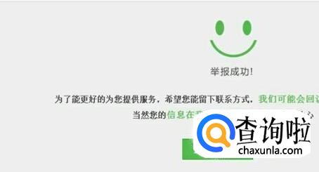 然后会跳转到举报成功的界面。举报成功过后可以通过提供联系方式来接受反馈。
