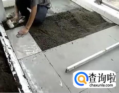 然后将瓷砖的背面润湿进行铺贴,把瓷砖按之前的尺寸整齐的放在水泥浆上,然后用橡皮锤轻轻敲击打平并抹去气泡。