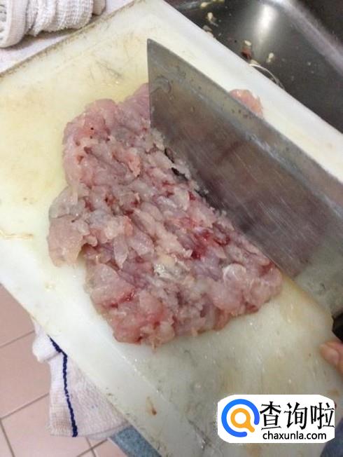 用刀将其砍成肉泥,一定要砍久一点,砍得有韧劲,