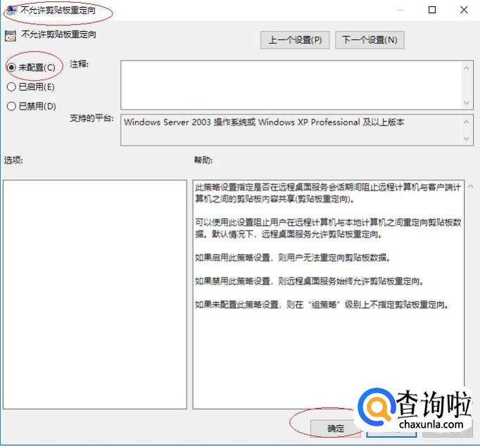 如图所示,弹出"不允许剪贴板重定向"对话框。勾选"未配置"单选框、点击"确定"按钮,本例到此希望对大家能有所帮助。