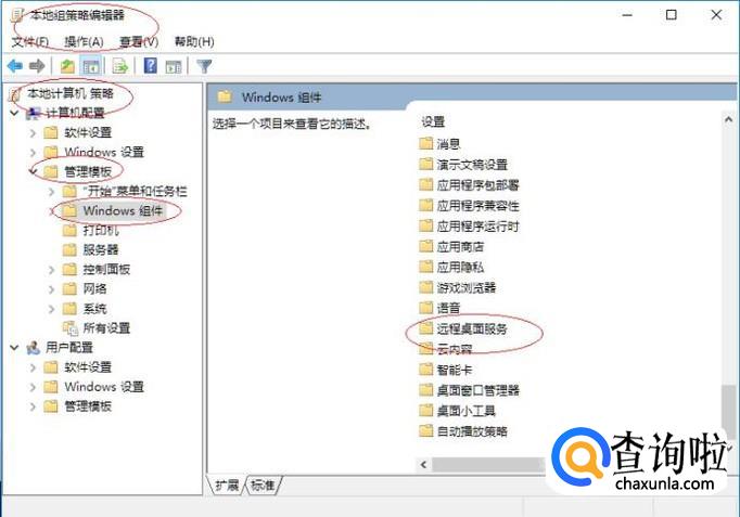 如图所示,展开左侧"计算机配置→管理模板→Windows 组件"目录。拖动右侧垂直滚动条,双击"远程桌面服务"文件夹。