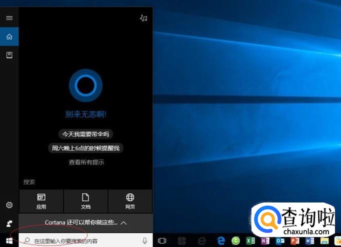 启动Windows 10操作系统,如图所示。点击任务栏搜索框,开始使用Cortana(小娜)智能语音助理。