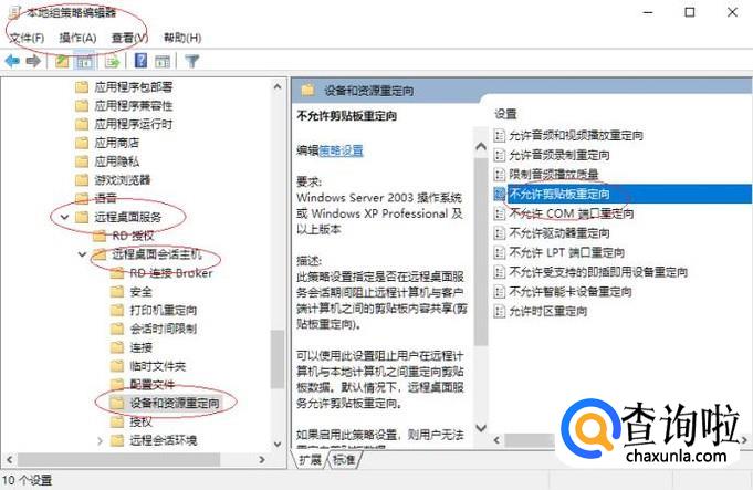展开"远程桌面服务→远程桌面会话主机→设备和资源重定向"文件夹,如图所示。双击右侧"不允许剪贴板重定向"项,用于编辑策略设置。