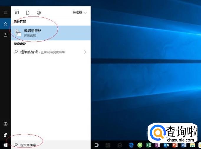 如图所示,搜索框输入"组策略编辑"。Cortana(小娜)显示搜索结果,点击"最佳匹配→编辑组策略"项。