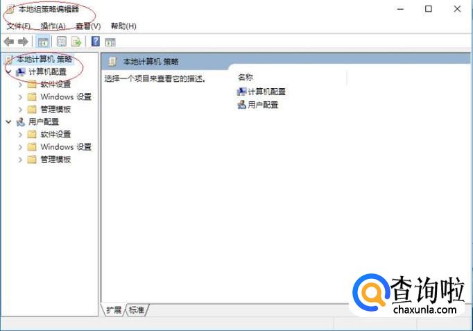 唤出"本地组策略编辑器"程序窗口,如图所示。展开左侧树形目录结构,选择"本地计算机策略→计算机配置"文件夹。