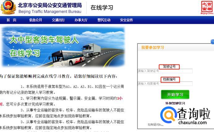 进入相应页面以后,输入自己的驾驶证号和档案编号,点击开始学习;学习完毕之后通过一个小考核就可以完成了。