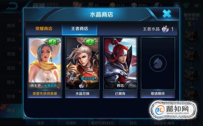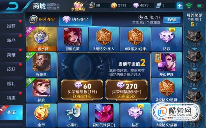 一定要记住坚持抽,每天270钻石抽五抽那个是最快的。然后差不多一个月就可以抽到一颗王者水晶,然后可以在王者商店兑换奖励。