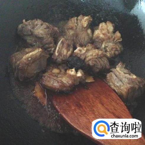第三步,将油烧开,放冰糖和姜。将排骨放入炒至水干。倒入生抽,加豆瓣和醋翻炒几下。