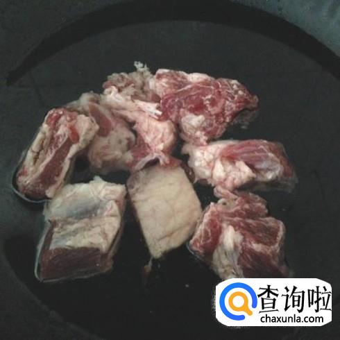 第二步,将牛排骨加料酒冷水下锅,等水开捞出排骨洗净。