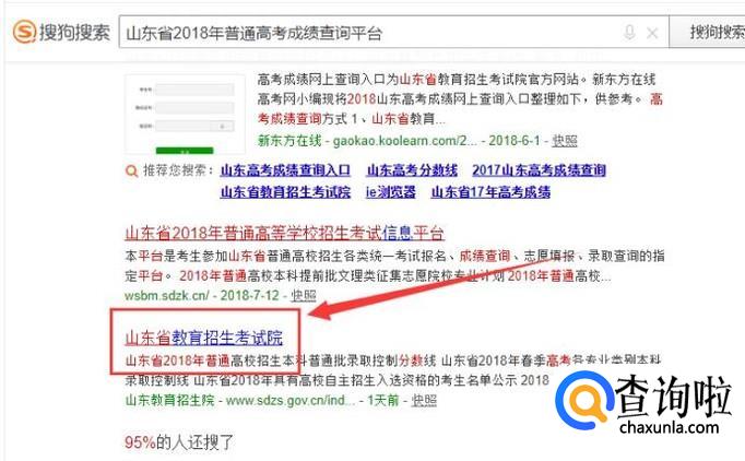 打开搜狗搜索,搜索“山东省2018年普通高考成绩查询平台”,点击图示位置进入查询窗口,如图所示。