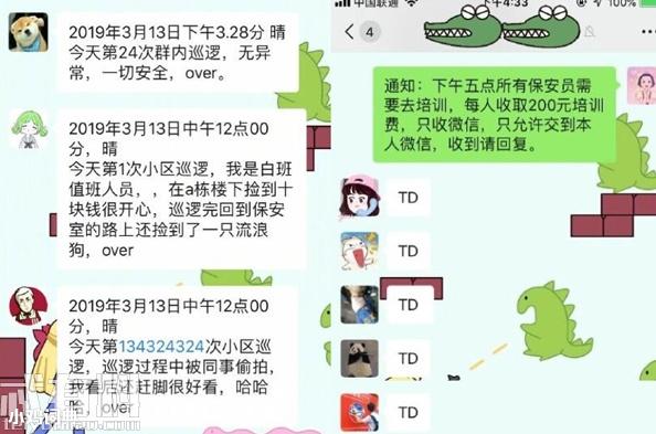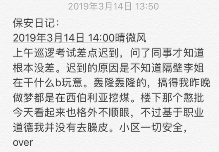 发在微博、朋友圈的保安日记一般都是语气平静带点丧的生活琐事记录。群聊中创作的一般都是沙雕群内巡视,群友们还会玩玩“下午保安培训,每人交200元”的保安工作群娱乐梗。