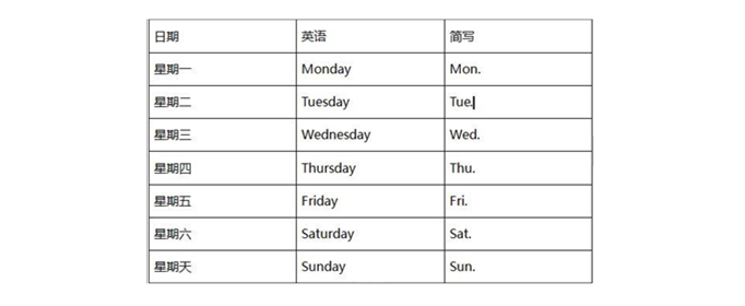 Tue.代表星期二Tuesday。周一到周日的英文缩写:周一(Mon.)、周二(Tue.)、周三(Wed.)、周四(Thu.)、周五(Fri.)、周六(Sat.)、周日(Sun.)。