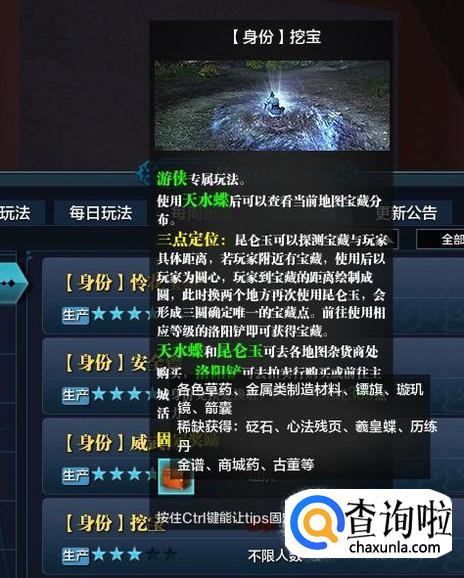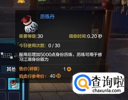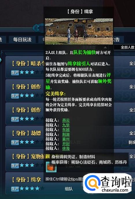 其中历练丹可以通过身份玩法中的“缉拿”和“挖宝”中概率获得,其中“挖宝”需要本身的身份为游侠方可参与,而“缉拿”则需要队长的身份为“捕快”即可参与。