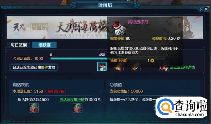 而高级历练丹则为绑定道具,无法进行交易,主要是通过日常活跃度奖励中获得,当日常活跃度达到450点时,则可固定获得一个高级历练丹。