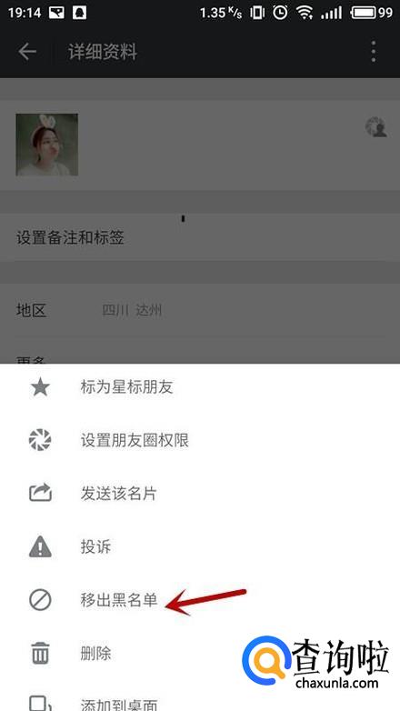 在弹框中,选择“移出黑名单”即可将好友移出黑明单,恢复正常通讯。