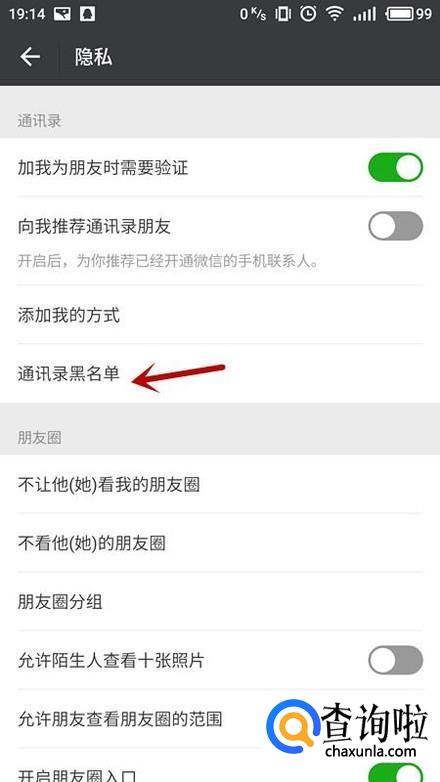 在隐私中,选择“通讯录黑名单”。