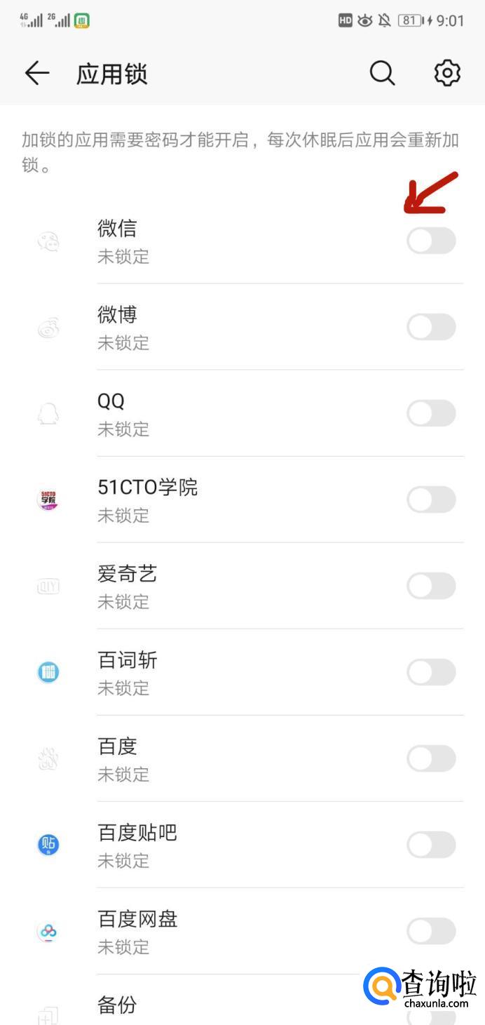 进入之后选择微信栏点击开启,如图所示。就开启了打开微信需要指纹解锁的功能啦。