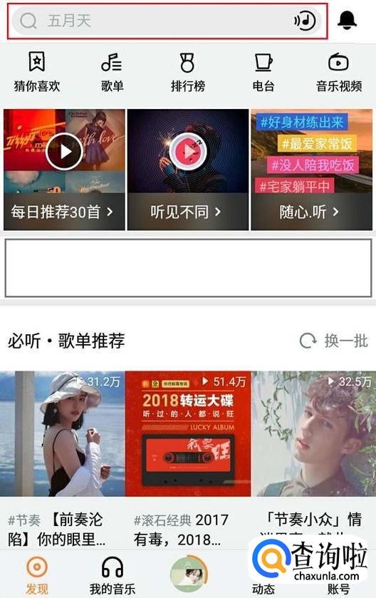 手机进入虾米音乐首页,在上方的搜索栏搜索所要下载的歌曲。