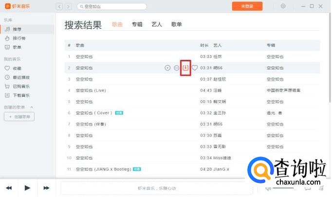 将鼠标移动至搜索结果里所要下载的歌曲上,点击出现的下载图标,即可开始下载。