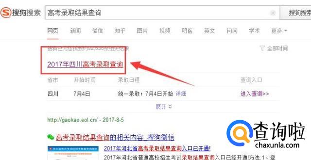 打开浏览器,输入关键词“高考录取查询”,下面出现高考录取查询的入口。