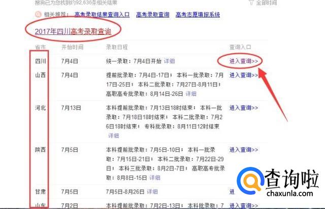 展开下方的查询结果,在左侧列表找到对应省份,右侧点击进入该省份的查询入口。