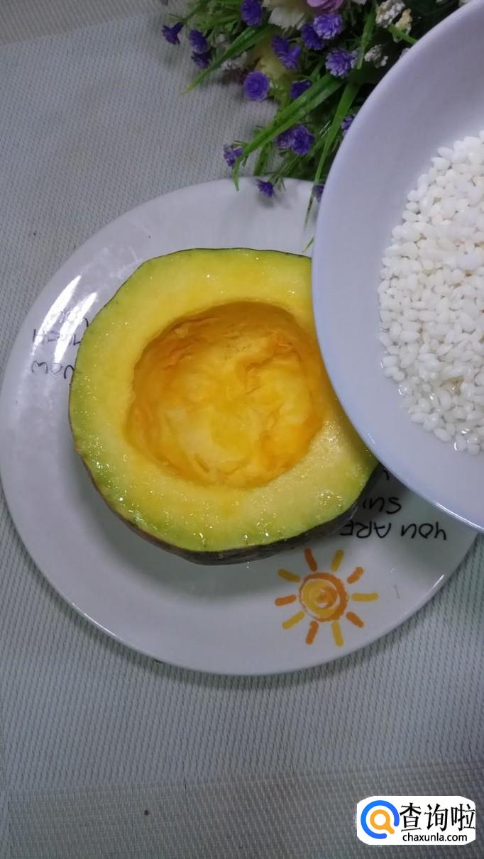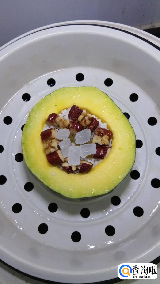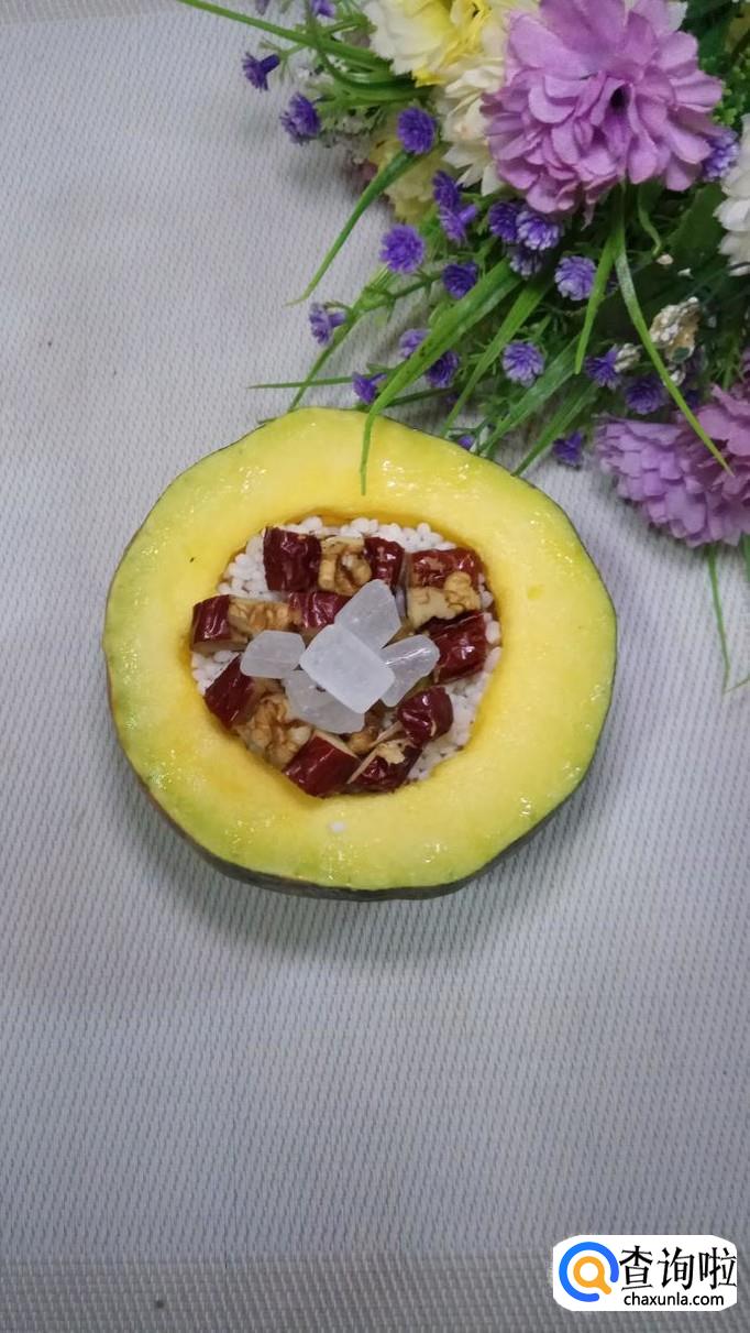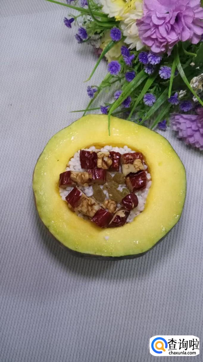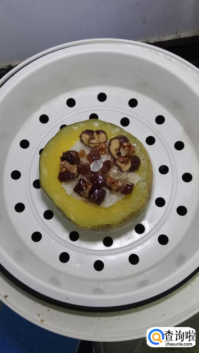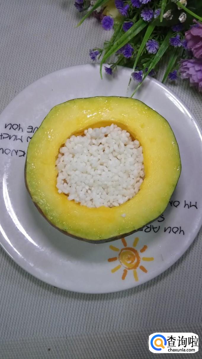 将泡好的糯米倒入南瓜中,在南瓜中蒸糯米,南瓜的香味可以进入到糯米中。