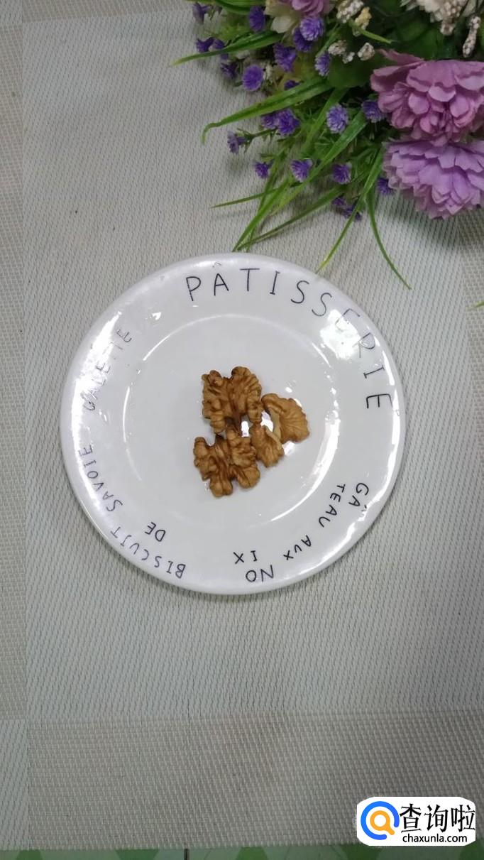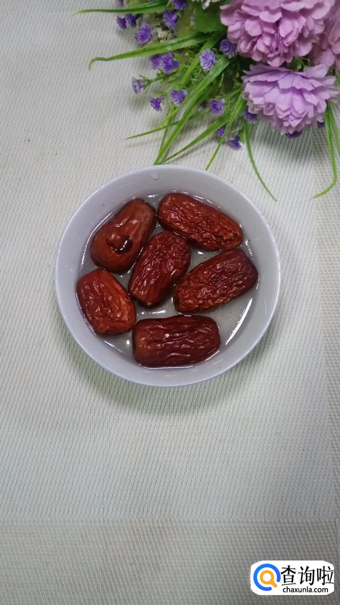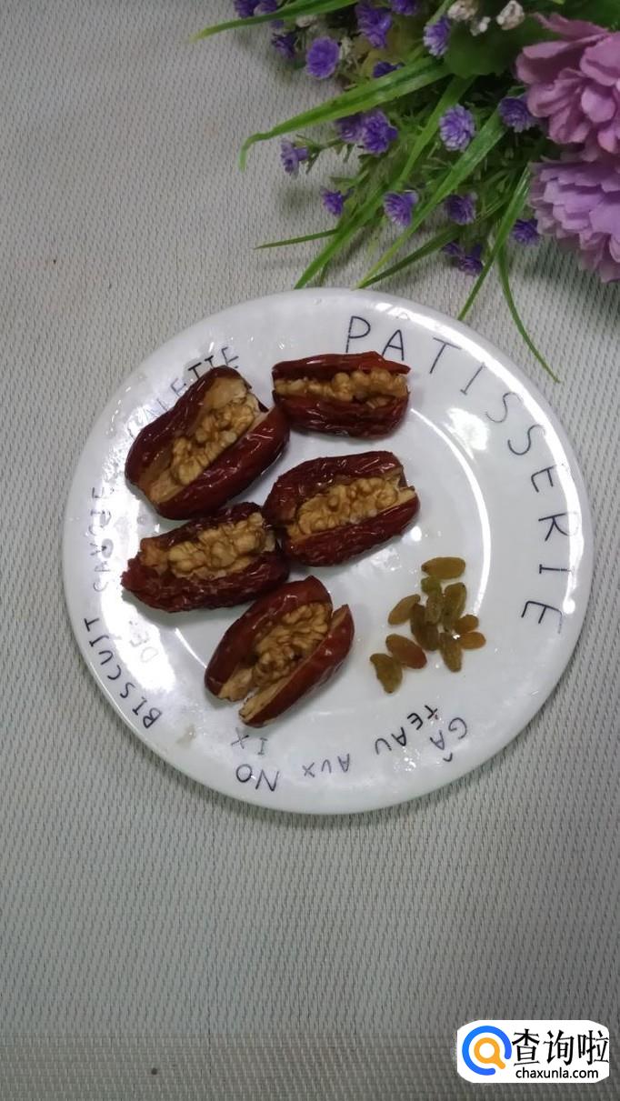 准备适量核桃仁,将红枣去核,把核桃仁加进去,可以用刀将红枣切成几份,这样方便入味。