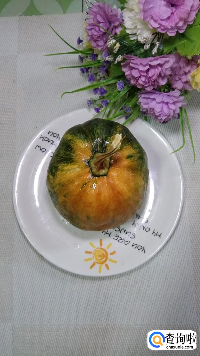 准备一个小的圆南瓜,用刀在1/3处切开,切成两半,然后挖去南瓜瓤,洗净后备用。