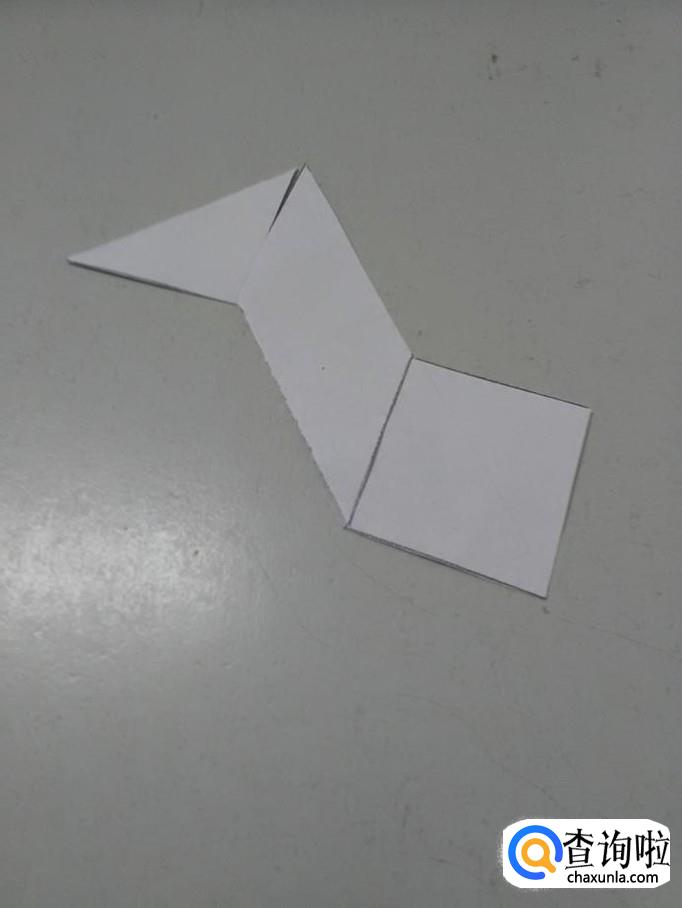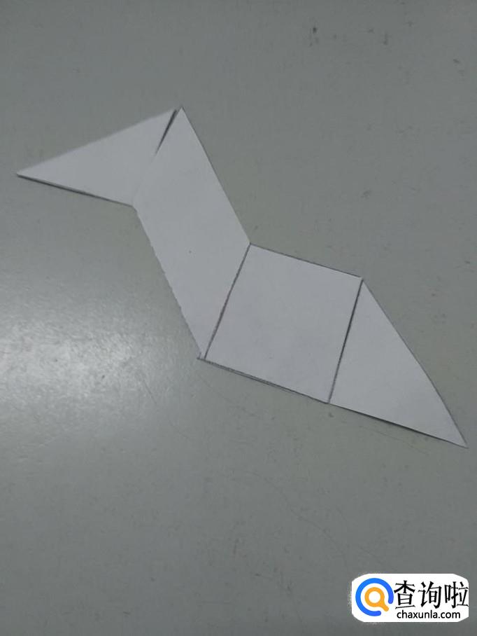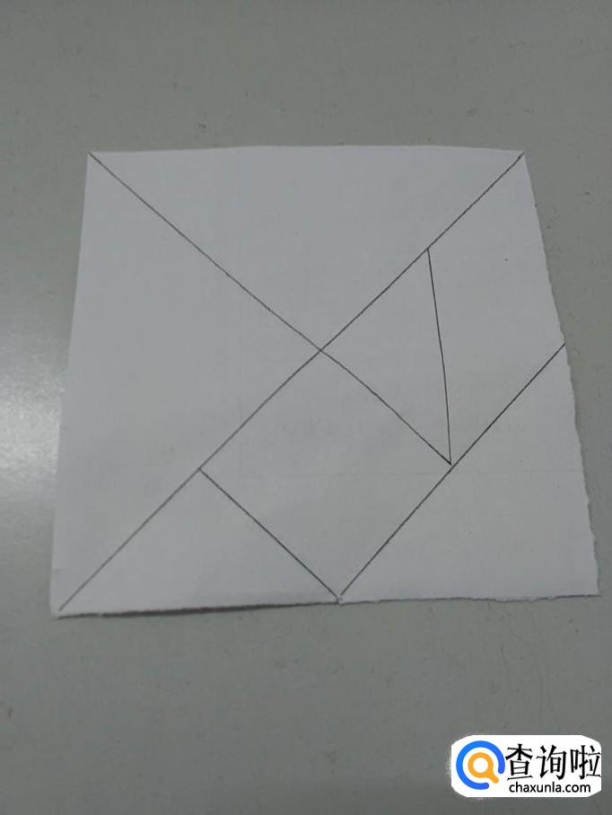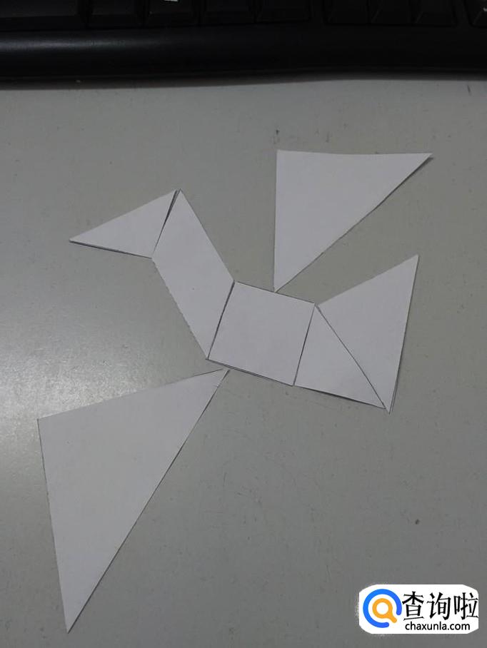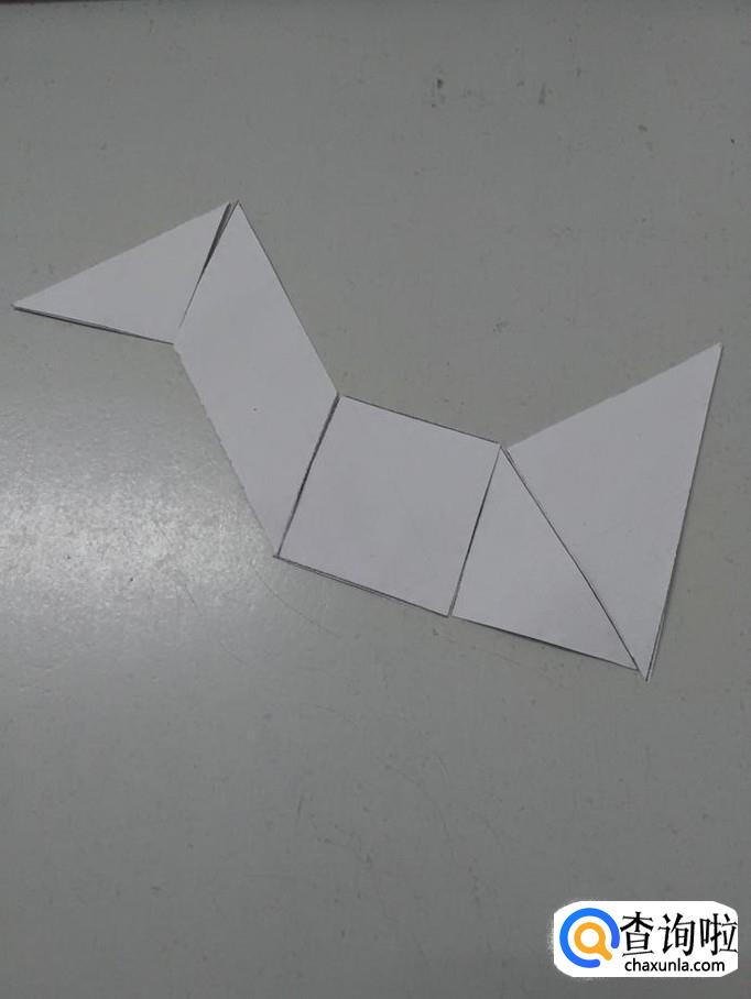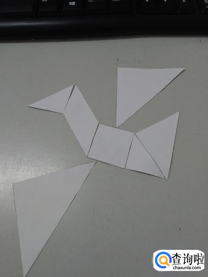 用另外一个小三角形,摆在正方形的右边,当作身体和尾巴连接的部位。