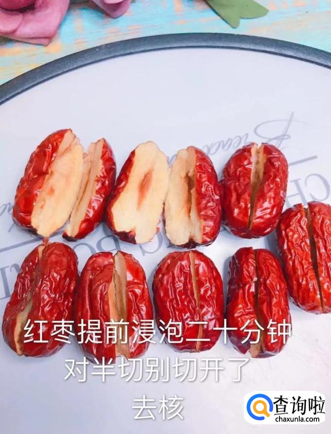 然后将红枣提前浸泡20分钟,对半切开,去核,如下图所示。
